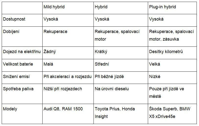 Srovnání mild hybridu, hybridu a plug-in hybridu